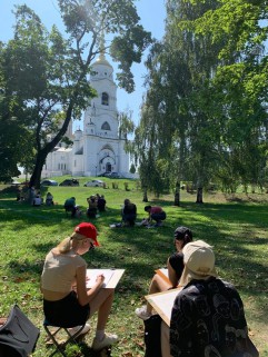 Во второй день мы отправились на пленэр к соборам в городе Владимир. Все ребята трудились, старались нарисовать красивые этюды. Многие люди проходили и с удивлением смотрели на всех юных художников.