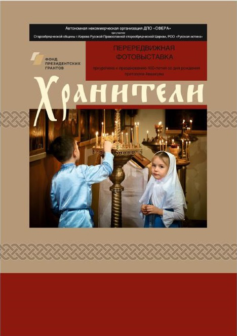 Сегодня состоялось открытие передвижной фотовыставки «Хранители», которая призывает к воплощению духовных, социальных и гражданских идеалов Руси. Выставка организована АНО ДПО "Сфера" г. Йошкар-Ола и старообрядческой общиной г. Киров РПСЦ при участии старообрядческих общин Глазова и Воткинска. Авторы работ Туманов Е.В. и Тригубенко С.В.. Выставка приурочена празднованию 400-летия со дня рождения протопопа Аввакума. Проект является победителем первого конкурса Фонда президентских грантов в 2019 году.