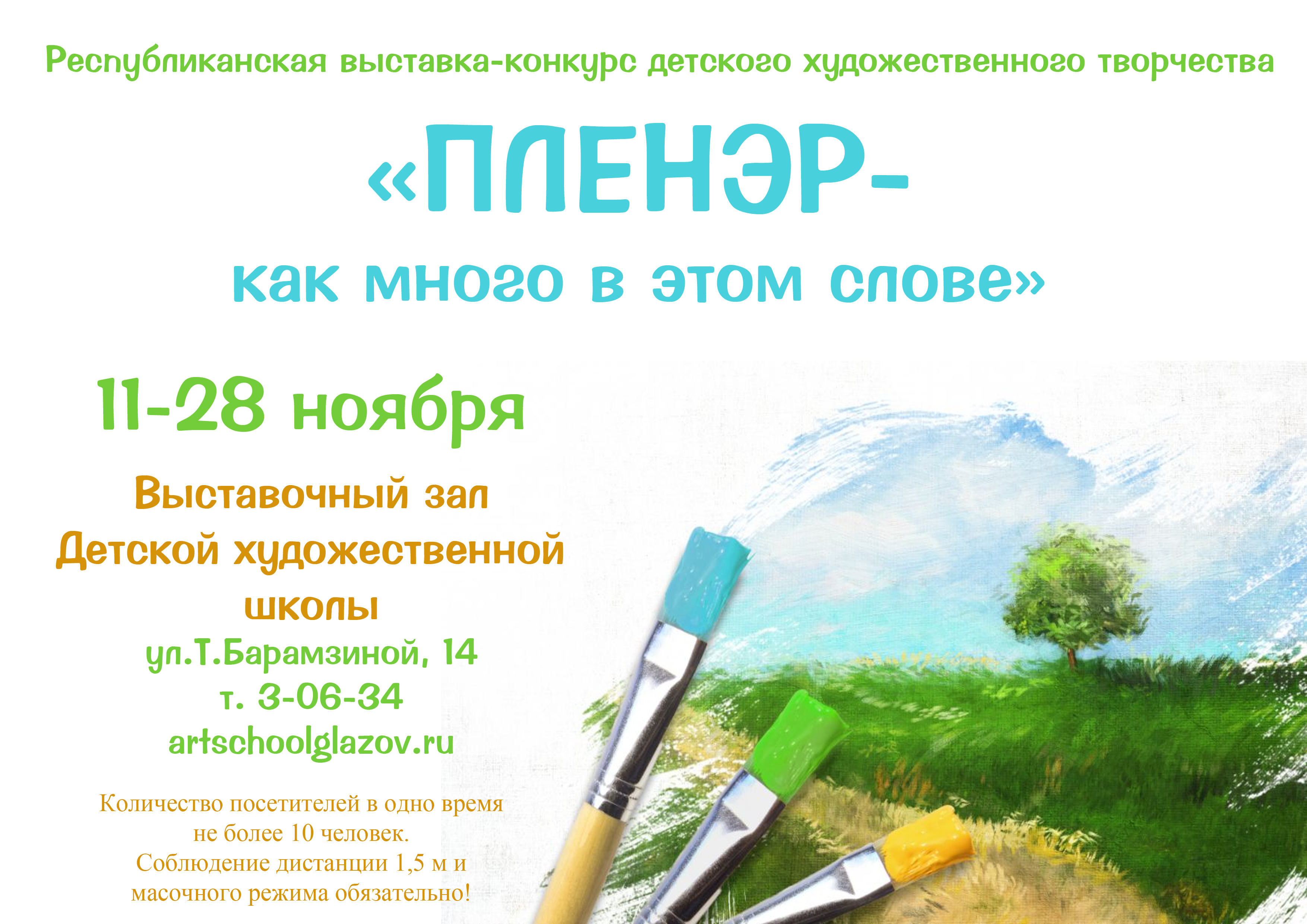 Подведены итоги Республиканской выставки-конкурса детского художественного творчества «Пленэр – как много в этом слове!». В числе 63-х участников представители ДШИ Завьяловской, Игринской №1 и №2, Як-Бодьинской, Балезинской, Детской школы искусств №2 и Детской художественной школы г. Глазова. Выставка оформлена в холле первого этажа школы и продлится до 28 ноября, а также приглашаем на виртуальную выставку работ