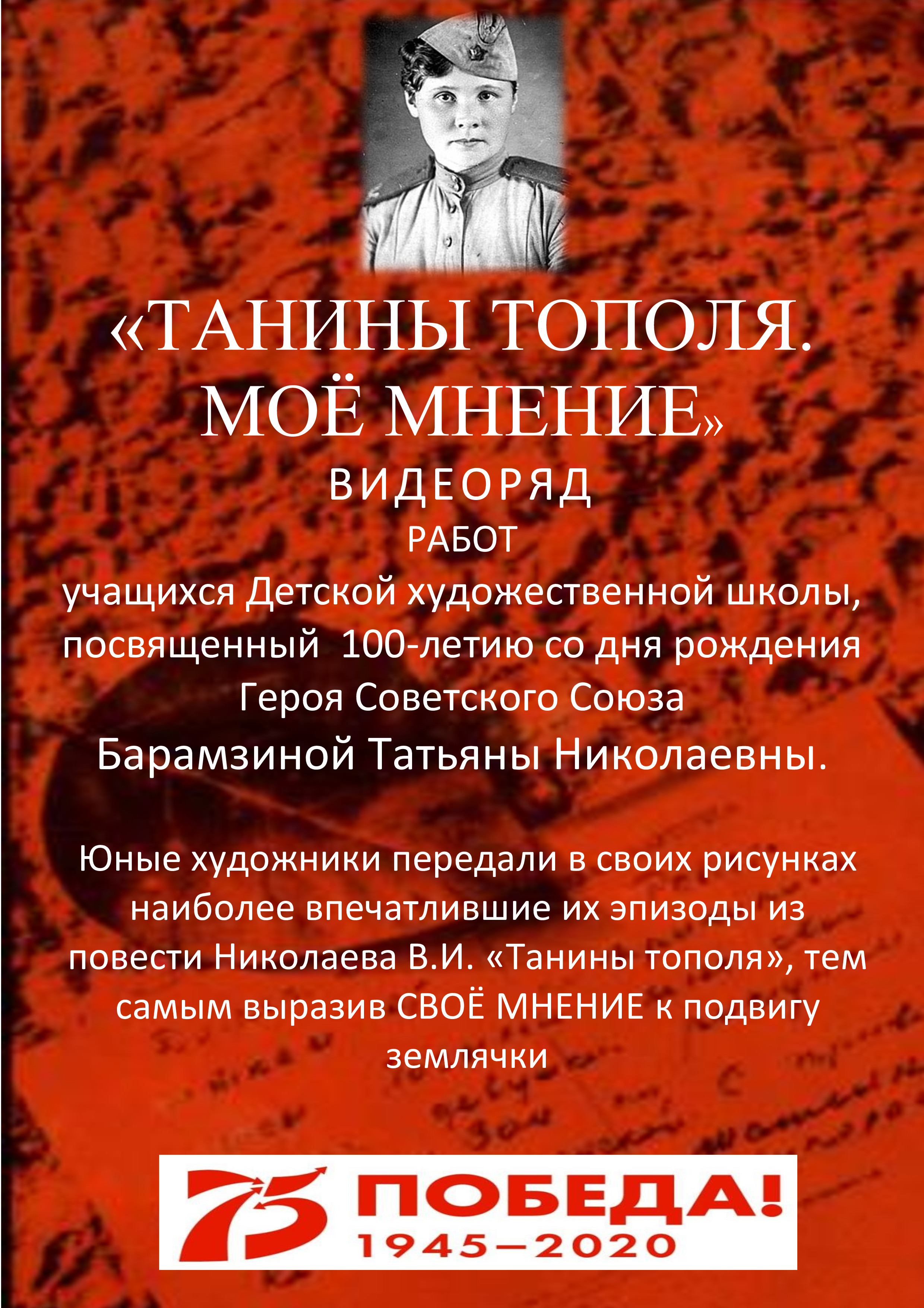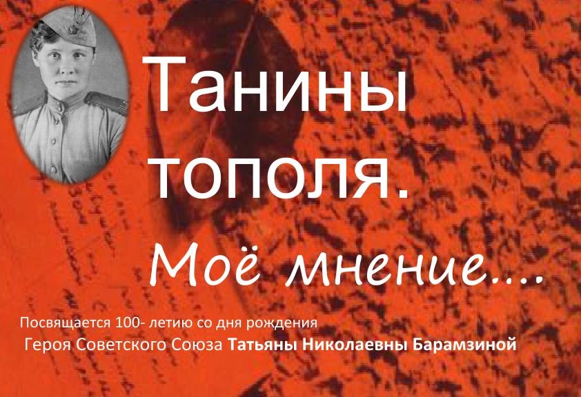 Мероприятие к 100-летию со дня рождения Татьяны Барамзиной проходило в формате иллюстративно-письменного обсуждения книги "Танины тополя" В. Николаева (кстати, единственной и не переиздававшийся с 1970 г.). Ценность мероприятия - это участие самих детей и родителей, которые помогли младшим ребяткам разобраться в содержании повести. А радует то, что учащиеся с желанием подключались к мероприятию, не остались равнодушными к подвигу своей землячки. Наиболее яркие эпизоды из повести некоторым удалось передать в своих рисунках и тем самым выразить СВОЁ МНЕНИЕ, а части ребят - зачитать. Теперь дети знают, в честь кого названа улица, по которой ходят каждый день в нашу школу. А ещё, что для подвига всегда есть место, а мы обязаны помнить о своих героях и рассказывать об этом другим.
