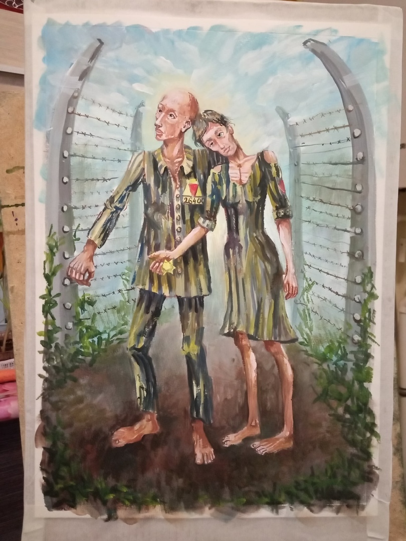 «Мне хотелось показать не только радость Победы, а что осталось за кадром. В своей работе я изобразила тех, кто остался там, в лагере Освенцим. Женщина держит Звезду Давида, или «Желтую звезду», которую евреи по требованию нацистов обязаны были носить в качестве особого отличительного знака. В моей работе она сорвала ее, показав этим свою силу воли, гордость и непреклонность», - говорит художник.