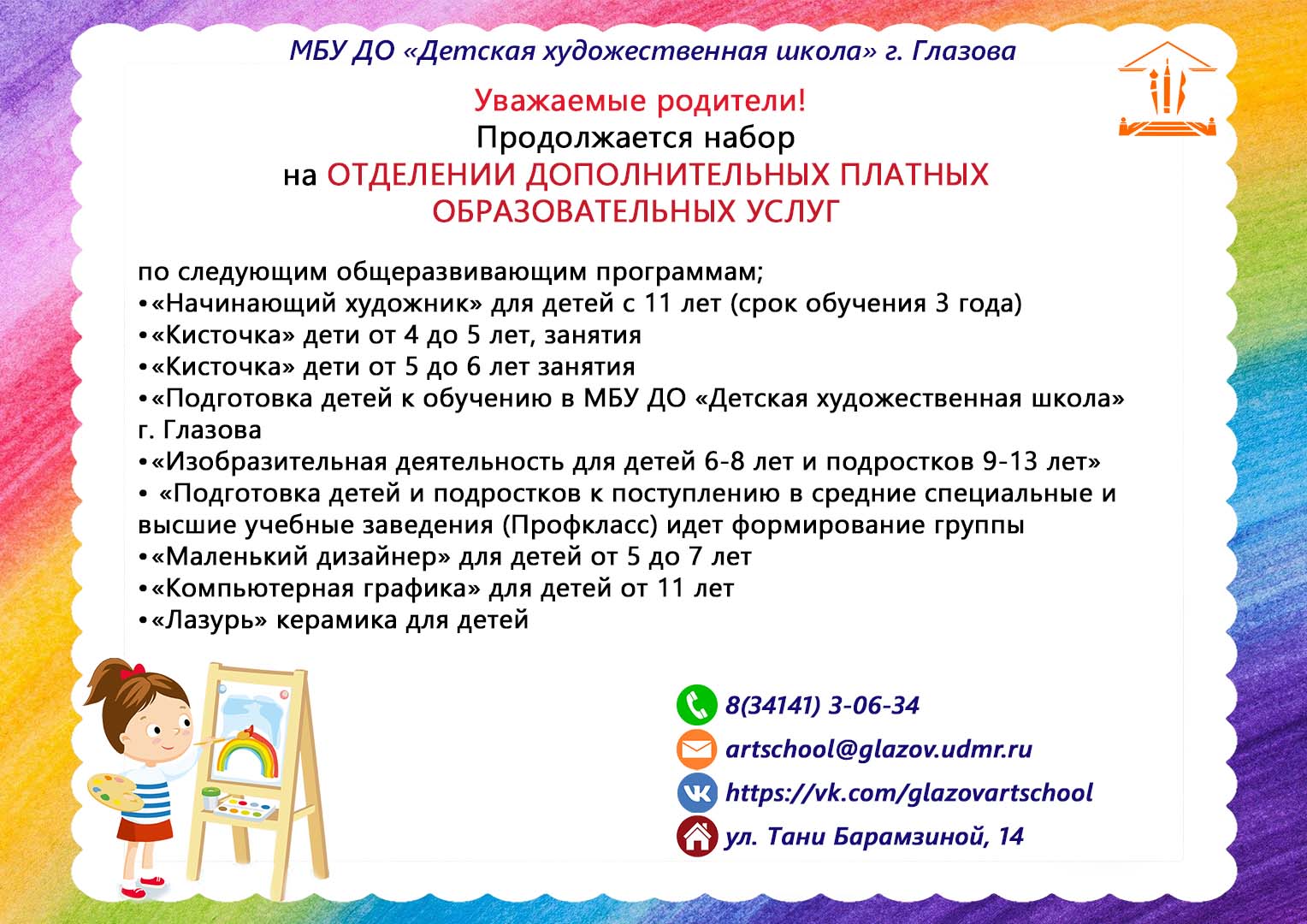 Детская художественная школа города Глазова - это школа красоты и гармонии, открывающая детям новый, невероятный и прекрасный мир искусства. В учреждении работают преданные своему делу специалисты, ежедневно отдающие частицу души и сердца детям - маленьким гражданам нашего города, во благо творческого развития и процветания школы. Коллектив преподавателей - это подлинные энтузиасты, отдавшие школе многие годы кропотливого труда. Молодые преподаватели продолжают, на основе академической школы, поиск новаторских идей, инновационных подходов к художественному образованию.